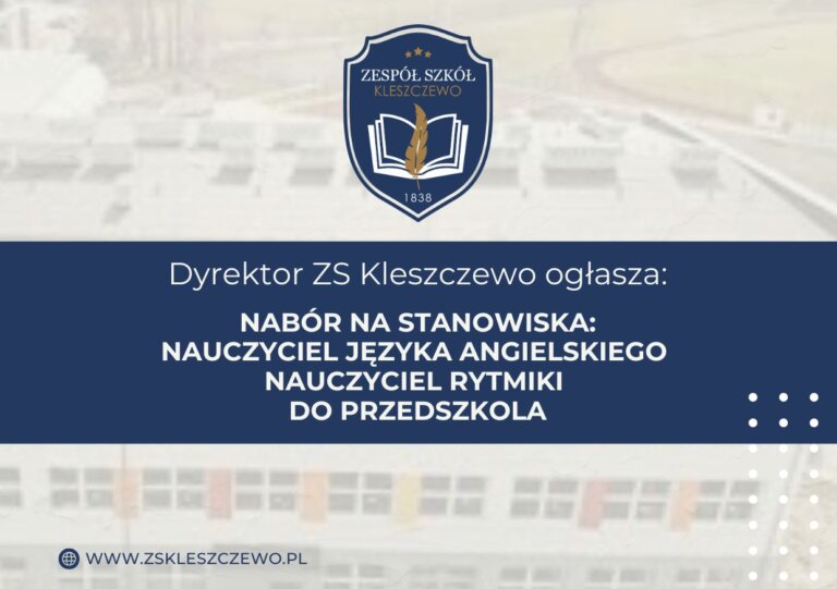 DYREKTOR ZESPOŁU SZKÓŁ W KLESZCZEWIE OGŁASZA NABÓR NA – NAUCZYCIELA JĘZYKA ANGIELSKIEGO DO PRZEDSZKOLA – 5/25 – NAUCZYCIELA RYTMIKI DO PRZEDSZKOLA – 5,5/25