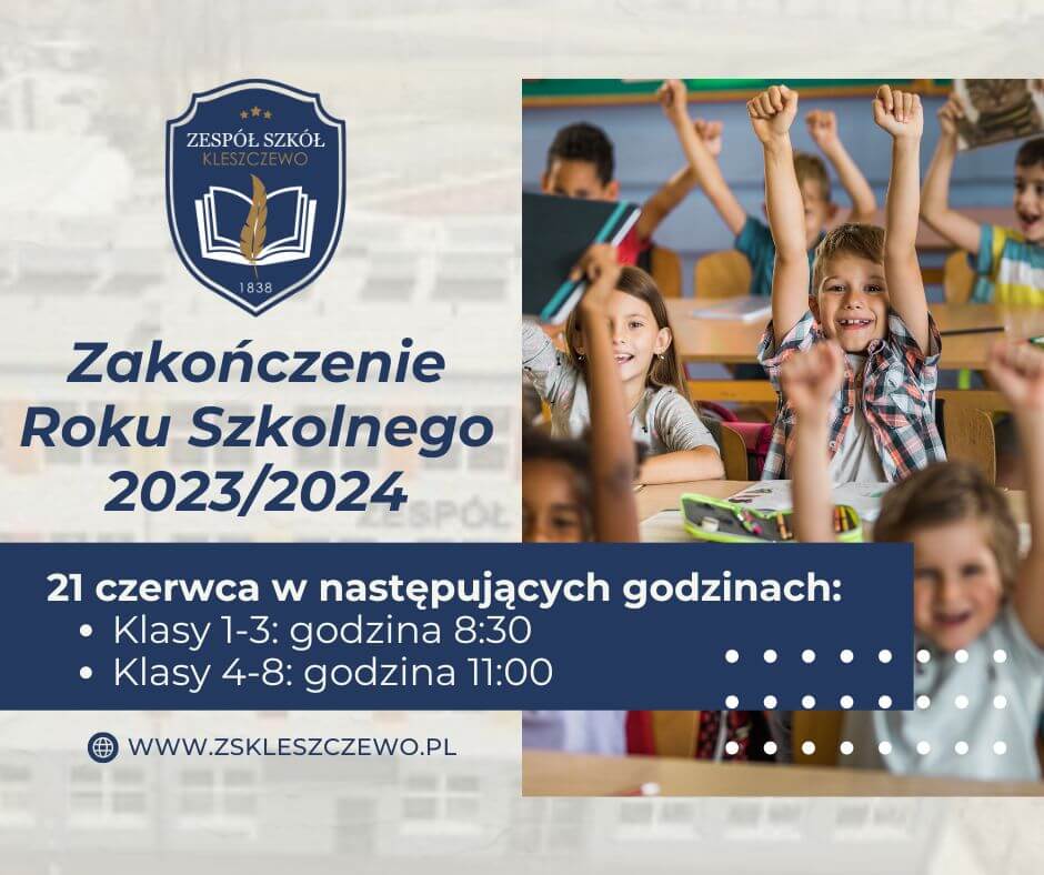 Szanowni Państwo, Informujemy, że uroczystość zakończenia roku szkolnego 2023/2024 odbędzie się 21 czerwca w następujących godzinach: Klasy 1-3: godzina 8:30 Klasy 4-8: godzina 11:00 Życzymy wszystkim udanych