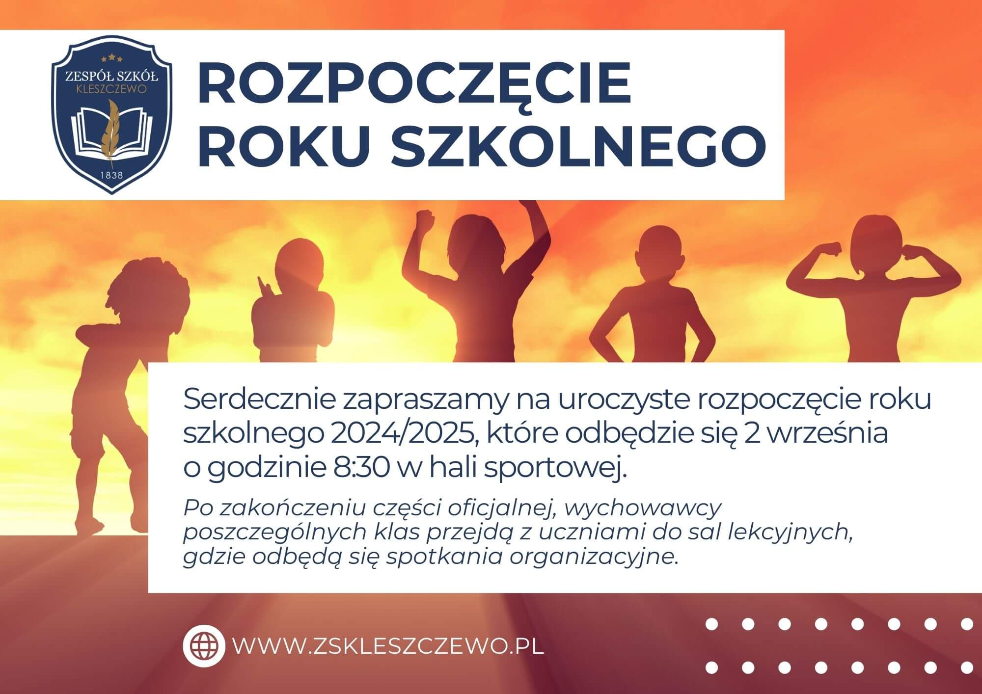 Serdecznie zapraszamy na uroczyste rozpoczęcie roku szkolnego 2024/2025, które odbędzie się 2 września o godzinie 8:30 w hali sportowej. Po zakończeniu części oficjalnej, wychowawcy poszczególnych klas przejdą z uczniami do sal