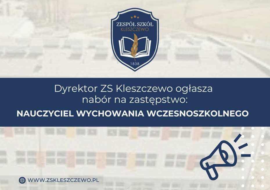 DYREKTOR ZESPOŁU SZKÓŁ W KLESZCZEWIE OGŁASZA NABÓR NA ZASTĘPSTWO NAUCZYCIEL WYCHOWANIA WCZESNOSZKOLNEGO – 1 etat Wymagania niezbędne: wykształcenie wyższe kierunkowe z przygotowaniem pedagogicznym stan zdrowia pozwalający na zatrudnienie