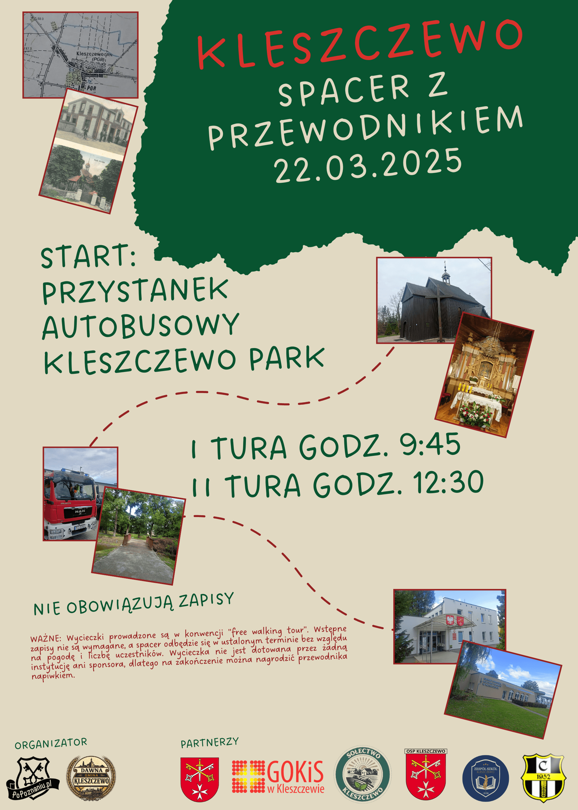 Serdecznie zapraszamy na wyjątkowy spacer z przewodnikiem po Kleszczewie! To doskonała okazja, by poznać historię i ciekawostki tego urokliwego miejsca. Data: 22 marca 2025 r. Miejsce zbiórki: Przystanek autobusowy Kleszczewo Park